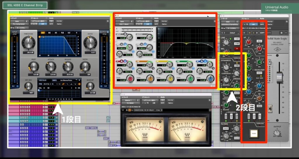 また私はいつもコンプレッサーを2段がけしています。1段目は音のアタックを揃えるためのコンプで、大体DAW純正のコンプレッサーで掛けていきます。そして2段目にビンテージ系のコンプを柔らかめに掛けています。