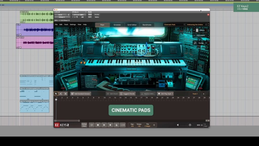 もう1つ購入した拡張音源は「CINEMATIC PADS」です。「CINEMATIC PADS」は、アナログシンセやモジュラーシンセなどを収録した音源です。デフォルトのサウンドを再生してみます。
