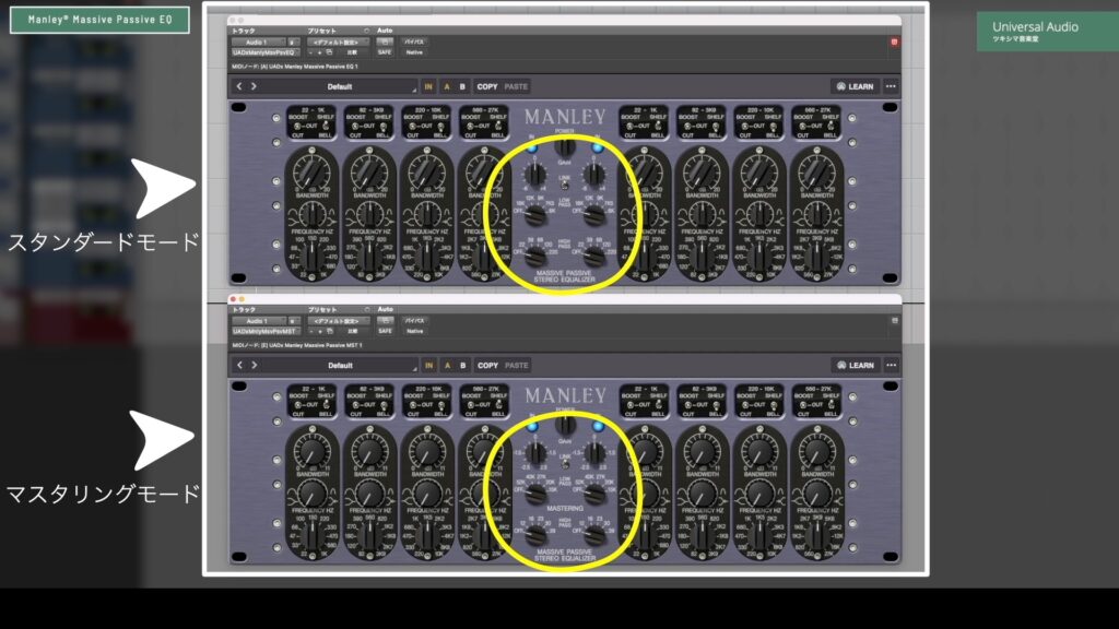 Manley® Massive Passive EQは、実機をエミュレートしたパッシブイコライザーのプラグインです。このプラグインには、スタンダードモードとマスタリングモードの2種類があります。選ぶモードによってゲインやQ幅が変わり、プラグイン中央部分の6つのノブの数値も違うものに変化しています。ざっくり言うとスタンダードモードは大きな値で、マスタリングモードは小さな値になります。