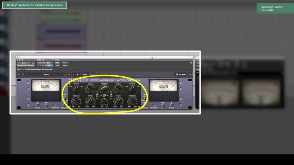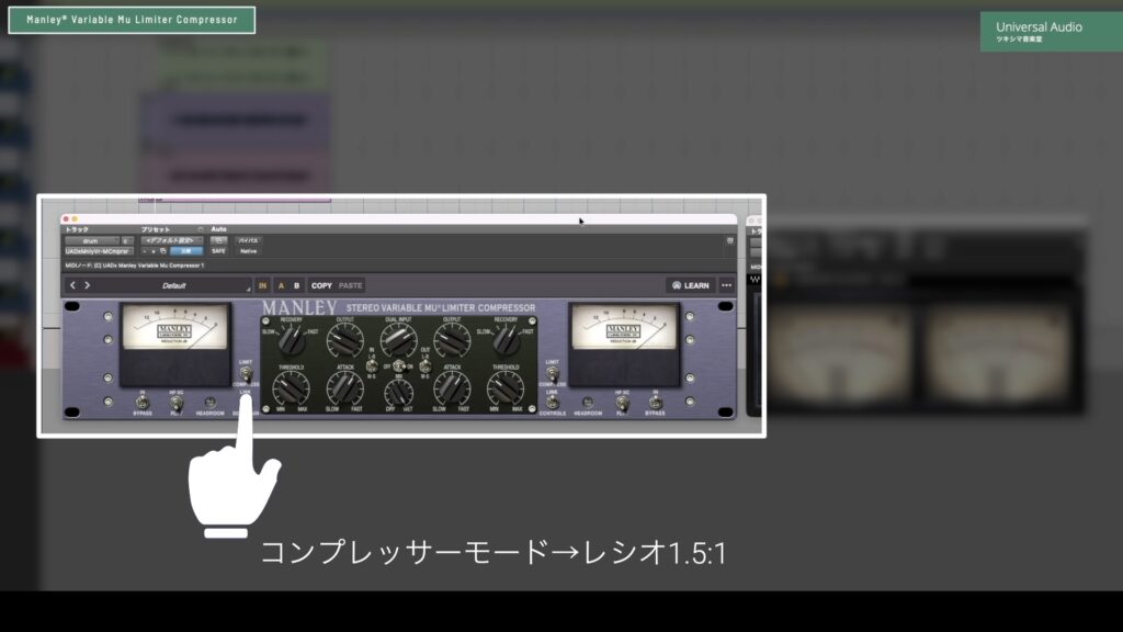 Manley® Variable Mu Limiter Compressorも実機をエミュレートしたプラグインです。このプラグインは、コンプレッサーモードにするとレシオが1.5:1に設定されます。レシオの数値を見ると「バストラックやマスタートラック用のコンプレッサーだな」ということが分かります。
