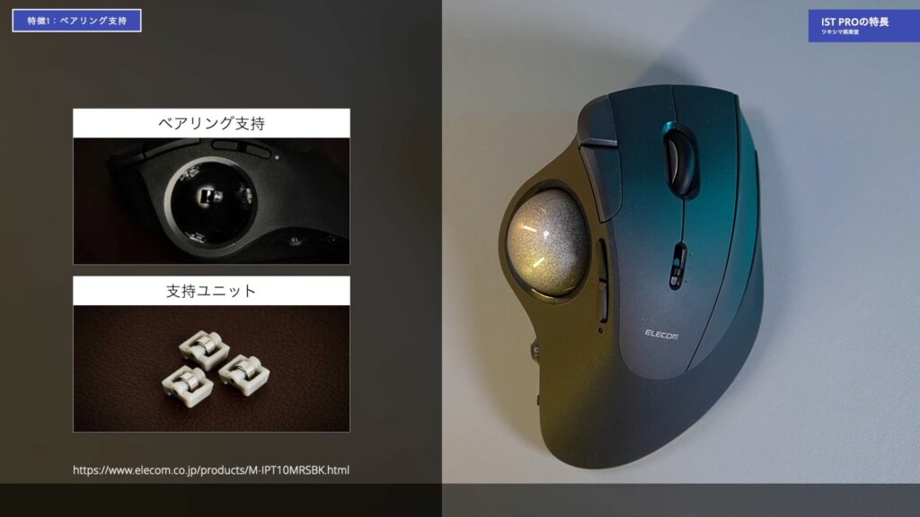 IST PROのトラックボールは、ベアリングユニットによって支持されています。そのため摩擦による抵抗が減り、トラックボールが滑らかに動きます。