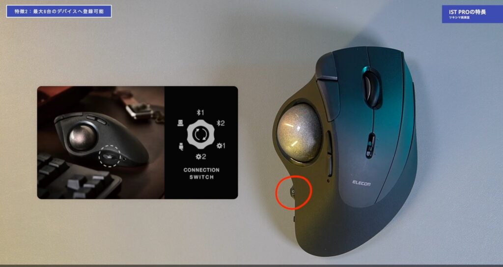 パソコンへの接続はIST PROの電源が入った状態で、いずれかのボタンを押すかトラックボールを動かせばすぐに接続されます。