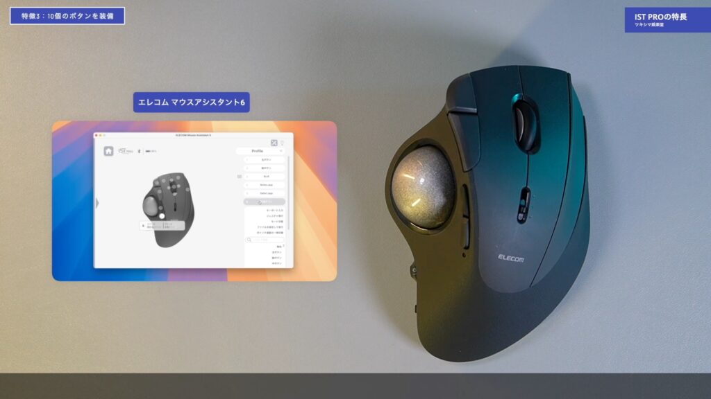 IST PROは、10個のボタンを装備しています。「エレコム マウスアシスタント6」を使用することでカスタマイズすることが可能です。ソフトは、見やすく分かりやすい操作画面だと思います。