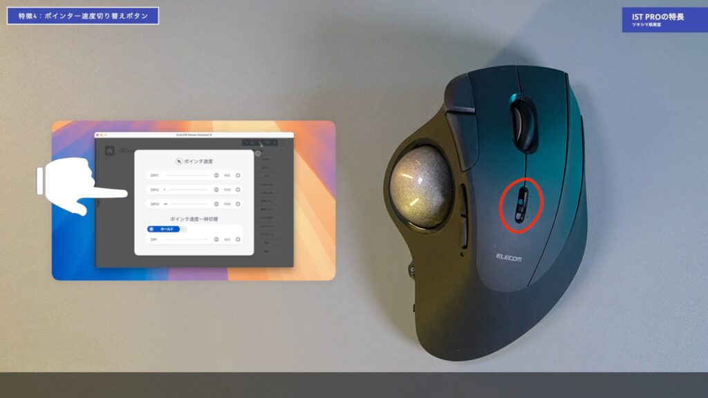 IST PROは本体中央にある物理ボタンで、3段階ポインターの速度を切り替えることが出来ます。初期設定はそれぞれ「500/1000/1500dpi」ですが、エレコム マウスアシスタント6を使用すると100~12,000dpiまで100dpi刻みで設定を変えることが出来ます。