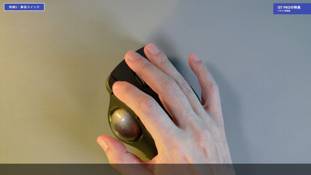 IST PROは、右ボタンと左ボタンが静音仕様です。実際に押してみると甲高い「カチカチ」という感じではなく、低い「コクコク」という音です。MX Ergoは「カチカチ」と大きい音がします。比べてみると、IST PROの方はマイクで拾えないくらいの小さい音です。一番使用するボタンが静音だとストレスが少なくて助かります。