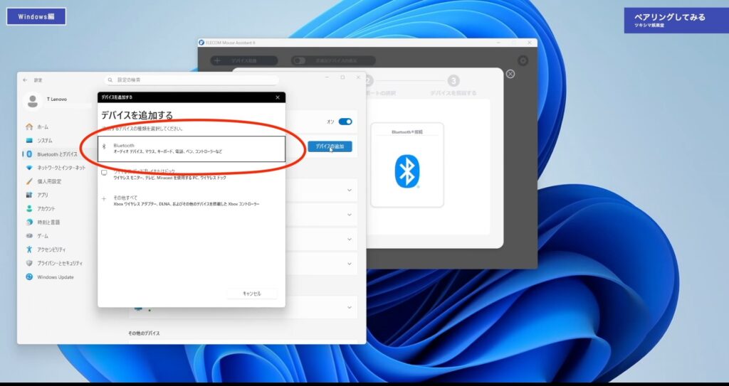 パソコンの「デバイスを追加する」という画面の「Bluetooth」をクリックします。