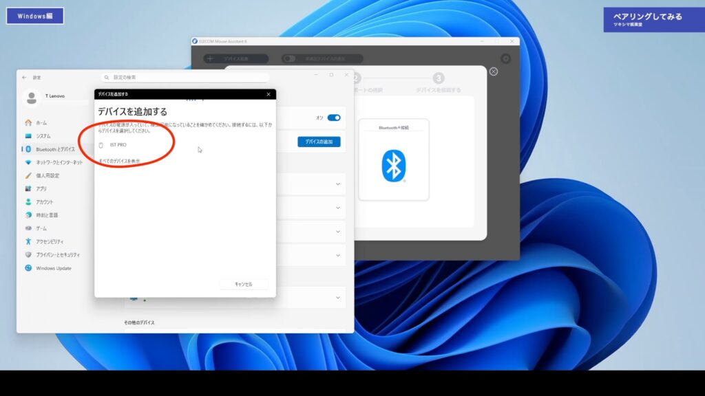 ペアリングが上手くいくと、パソコンの「デバイスを追加する」という画面に「IST PRO」が表示されますので、クリックして選択します。