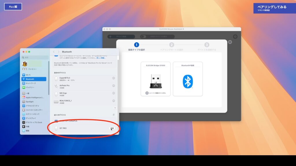 MacのBluetooth欄の「近くのデバイス」のところに「IST PRO」と表示されたら「接続」をクリックします。