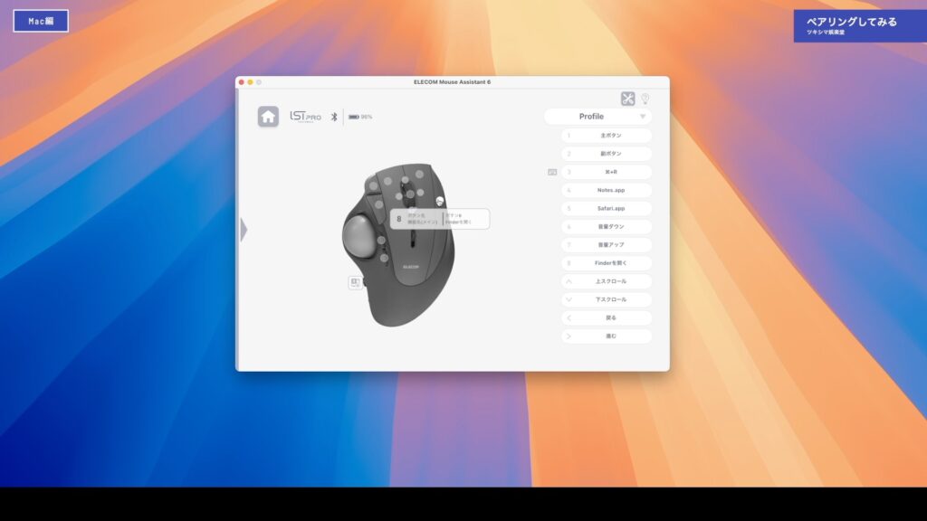 ペアリングが完了した後は、エレコム マウスアシスタント6を使用してポインターの速度やボタンの割り当てを変更することが出来ます。
