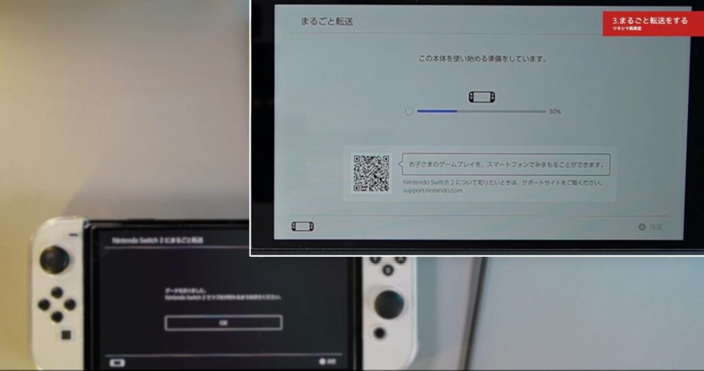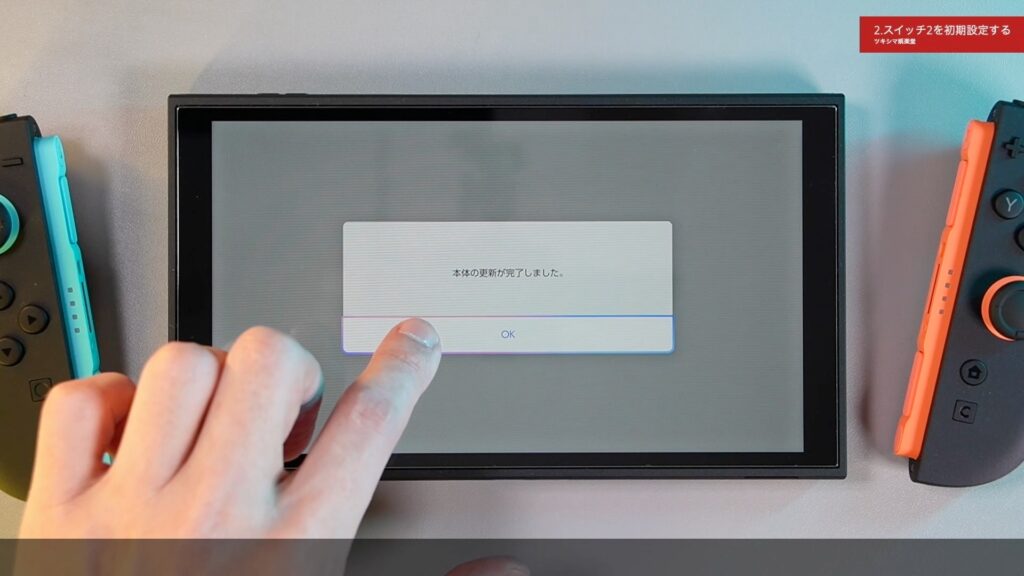 データの転送が終わりました。スイッチ2はこの本体を使い始める準備をしています。