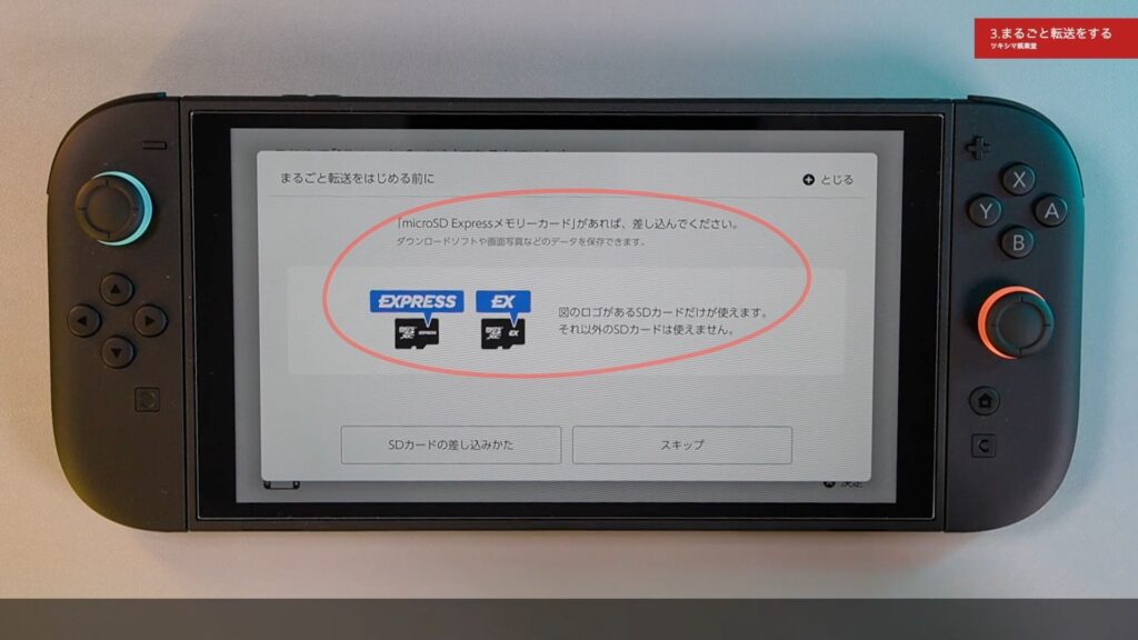 「microSD Expressメモリーカードがあれば差し込んでください」と画面に表示されています。