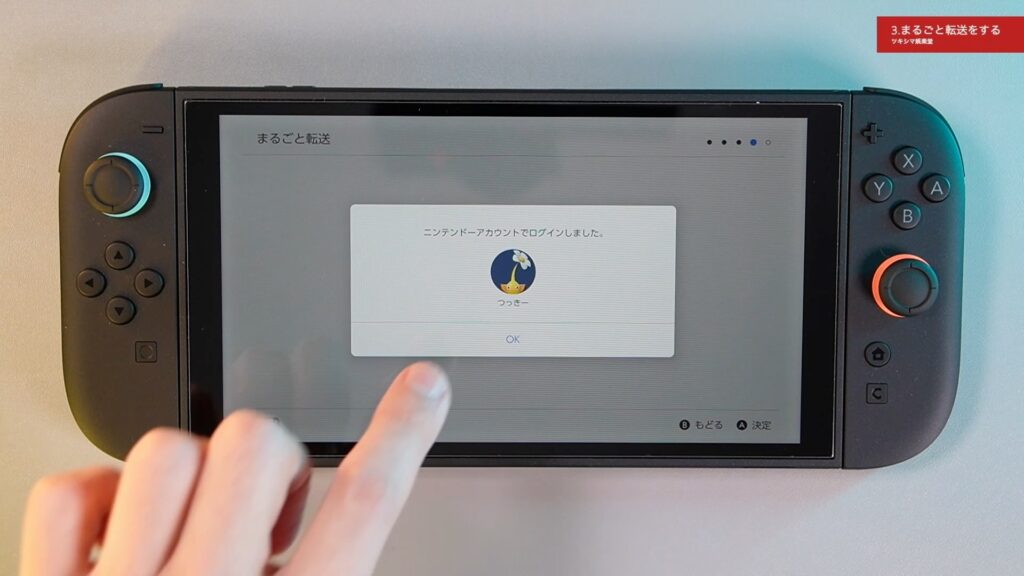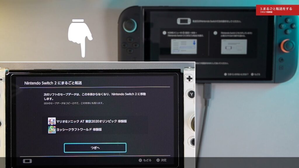 そして有機ELモデルのデータをスイッチ2に「まるごと転送」しますので、「つぎへ」を選びます。