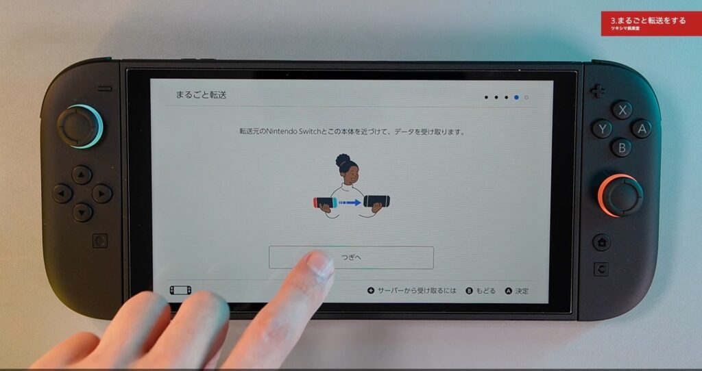 次は転送元のNintendo Switchとこの本体を近づけて、データを受け取ります。「つぎへ」をタップします。