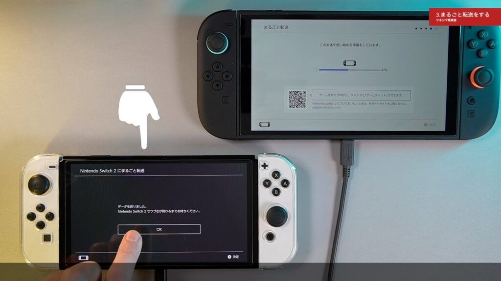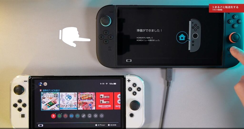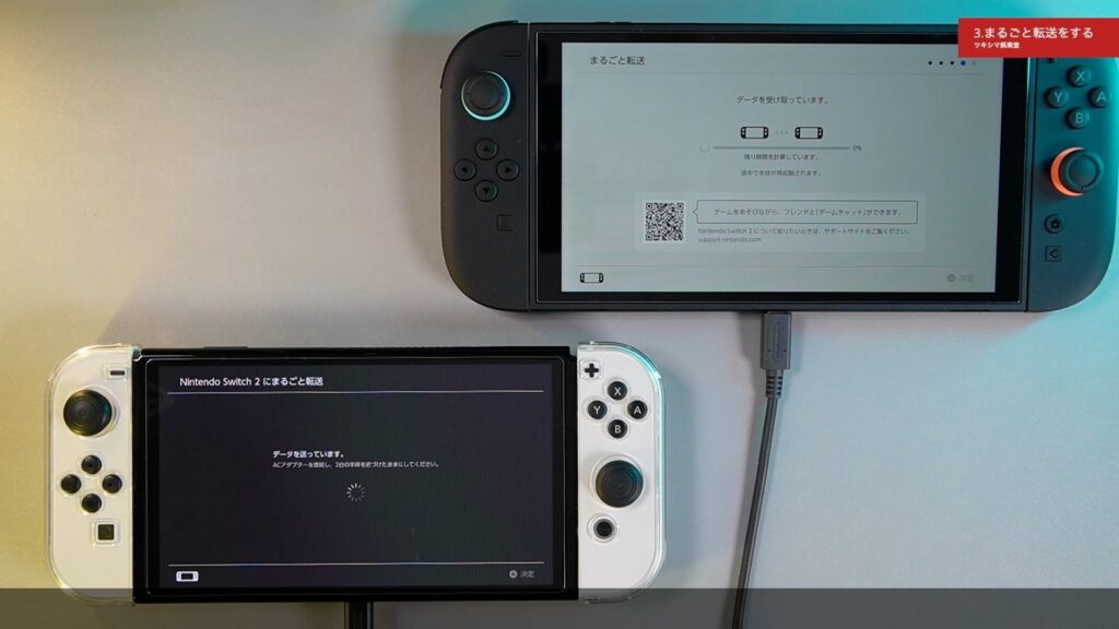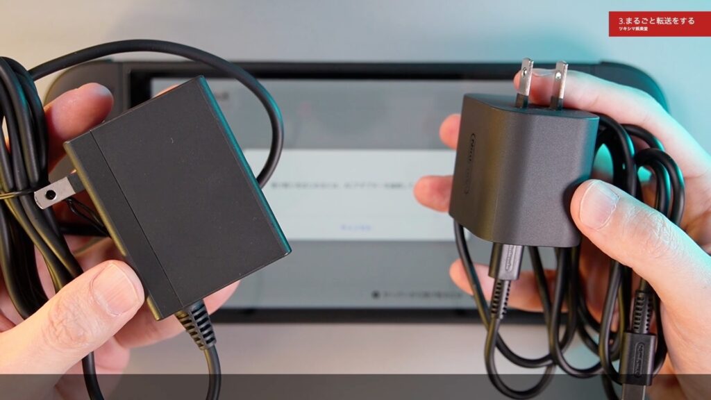 ここでACアダプターを接続するように指示がありますので、新しいスイッチ2と転送元の有機ELモデルにそれぞれ接続します。