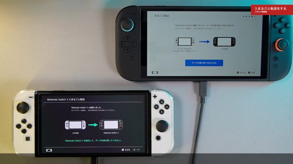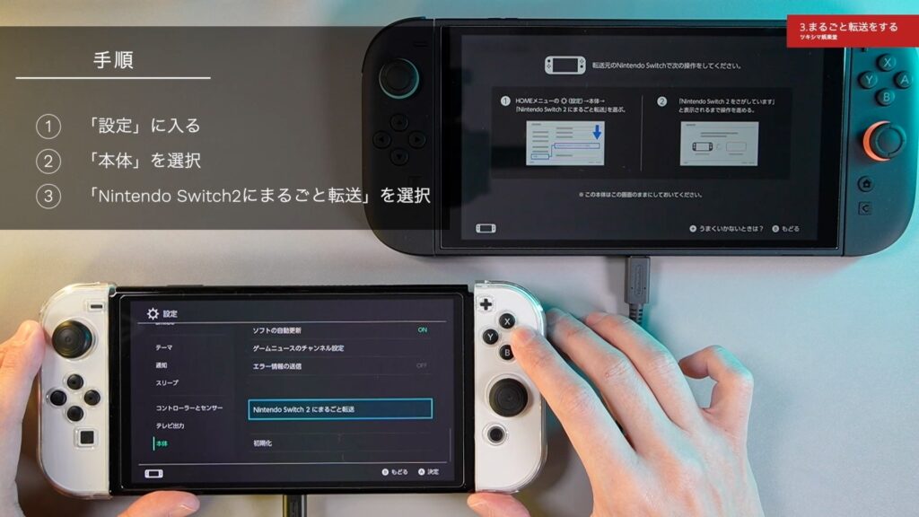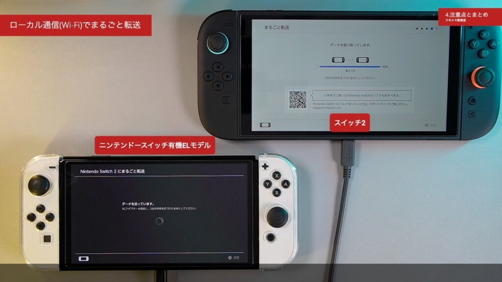 今回の「まるごと転送」は、Wi-Fiを使用したローカル通信で行いました。ローカル通信で「まるごと転送」を行う場合は、転送元のニンテンドースイッチとスイッチ2の両方の本体が、電源が入る状態で手元にある必要があります。