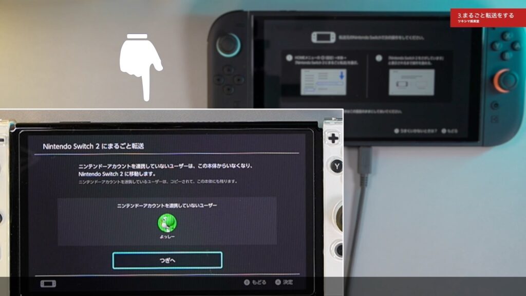 アカウントと連携していないユーザーも、新しいスイッチ2へ移動します(もちろんアカウントと連携しているユーザーも新しいスイッチ2へ移動します)。「つぎへ」をタップします。