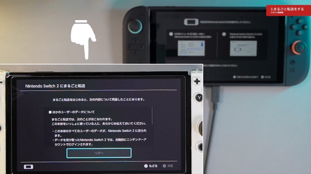 スイッチ2本体にJoy-Con2をセットして「まるごと転送に進む」を選択します。
