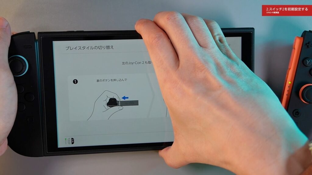 更新をダウンロードしている間にスイッチ2の様々な使い方の説明が始まります。Joy-Con2を取り外すように指示がありますので従います。