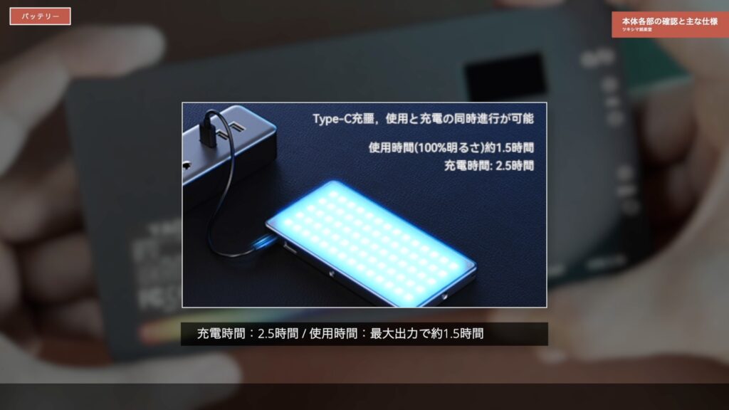 このRGBライトは、4000mAhのバッテリーを内蔵しています。約2.5時間で充電が完了し、最大出力で1.5時間使用することが出来ます。