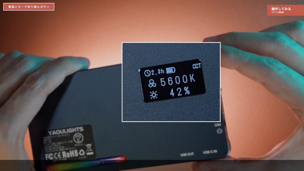 電源が入るとライト背面のディスプレイも点灯して、現在のモード、色、明るさ、そしてバッテリーの残量と使用可能時間が表示されます。(CCTモード)